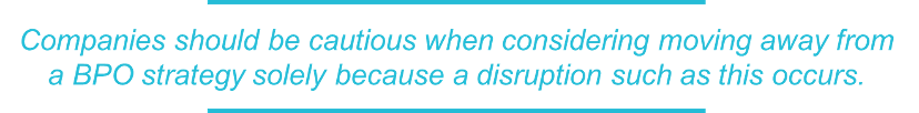 When a crisis of this magnitude occurs, we expect BPOs will take even more precautions to mitigate future business continuity risks from events like a fast-moving pandemic. Companies should be cautious when considering moving away from a BPO strategy solely because a disruption such as this occurs. This is a learning opportunity—long term, we do not see this shifting the strategic view on how to work with BPOs, concludes Robinson.
