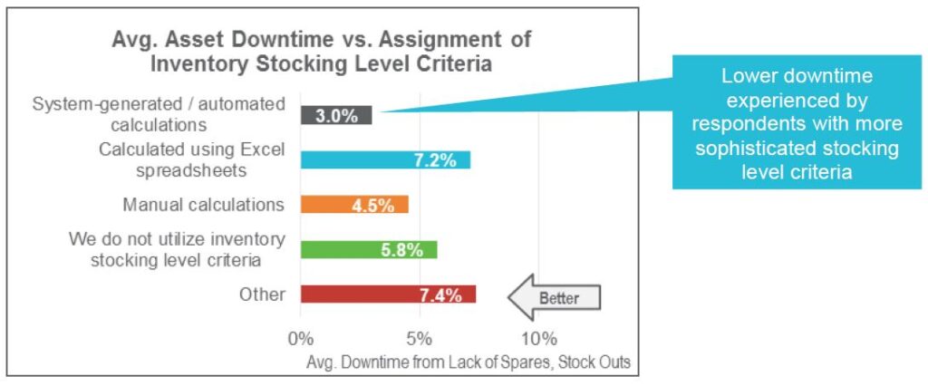 - Assignment of stocking level criteria – Approximately 50% of survey respondents across industries indicated some kind of system-generated or automated calculation to assign inventory stocking level criteria, while 24% of all participants still use manual calculations
