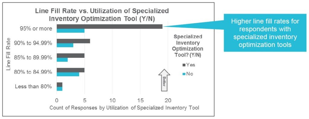 - Inventory performance metrics – More than half (53%) of all respondents across all industry groups use Inventory Turns Ratio, and less than a third use Line Fill Rate (32%)