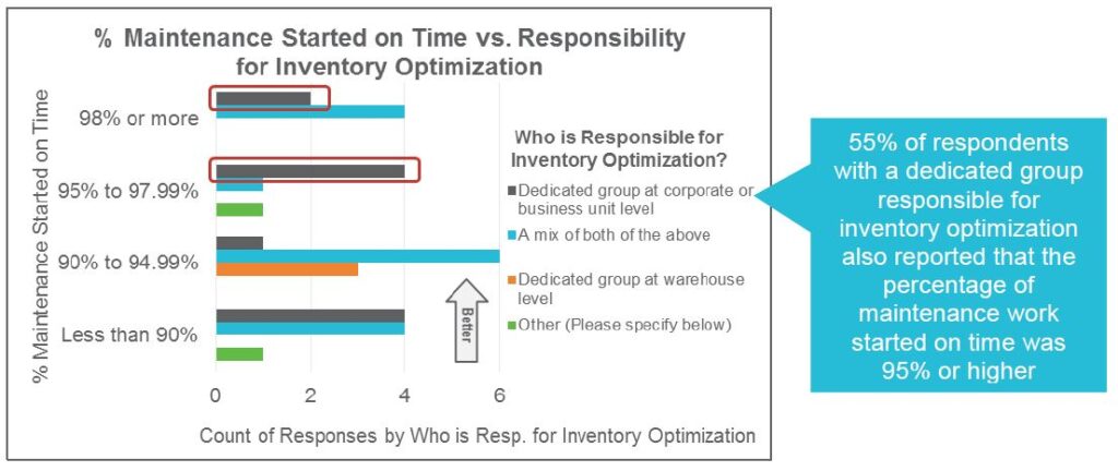 - Line Fill Rate for Critical Spares – 53% of all respondents reported “98% or more,” led by approximately 60% of Mining, Metals Processing & Fabrication respondents and approximately 50% of Power Utilities respondents